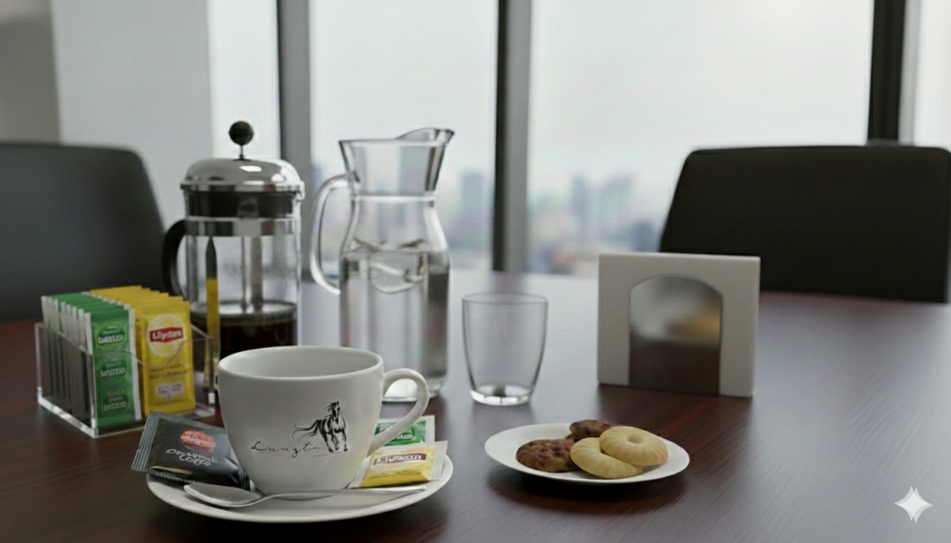 Incluye Servicio de asistencia en Líquidos para 10 personas, se compone de 1 Café de Grano o 1 Té Lipton o 1 Té de Infusiones, acompañado de 4 galletas dulces, por unidad.