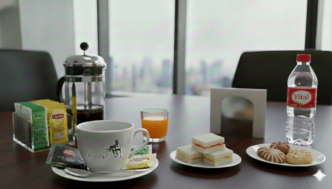 Incluye Servicio de asistencia en Líquidos para 10 personas, se compone de 1 Café de Grano o 1 Té De infusiones o Lipton, 1 Jugo Natural, 1 Agua Mineral, Leche descremada a gusto, 3 tapaditos con rellenos de pastas surtidos y 4 galletas dulces surtidas, por cada unidad.
