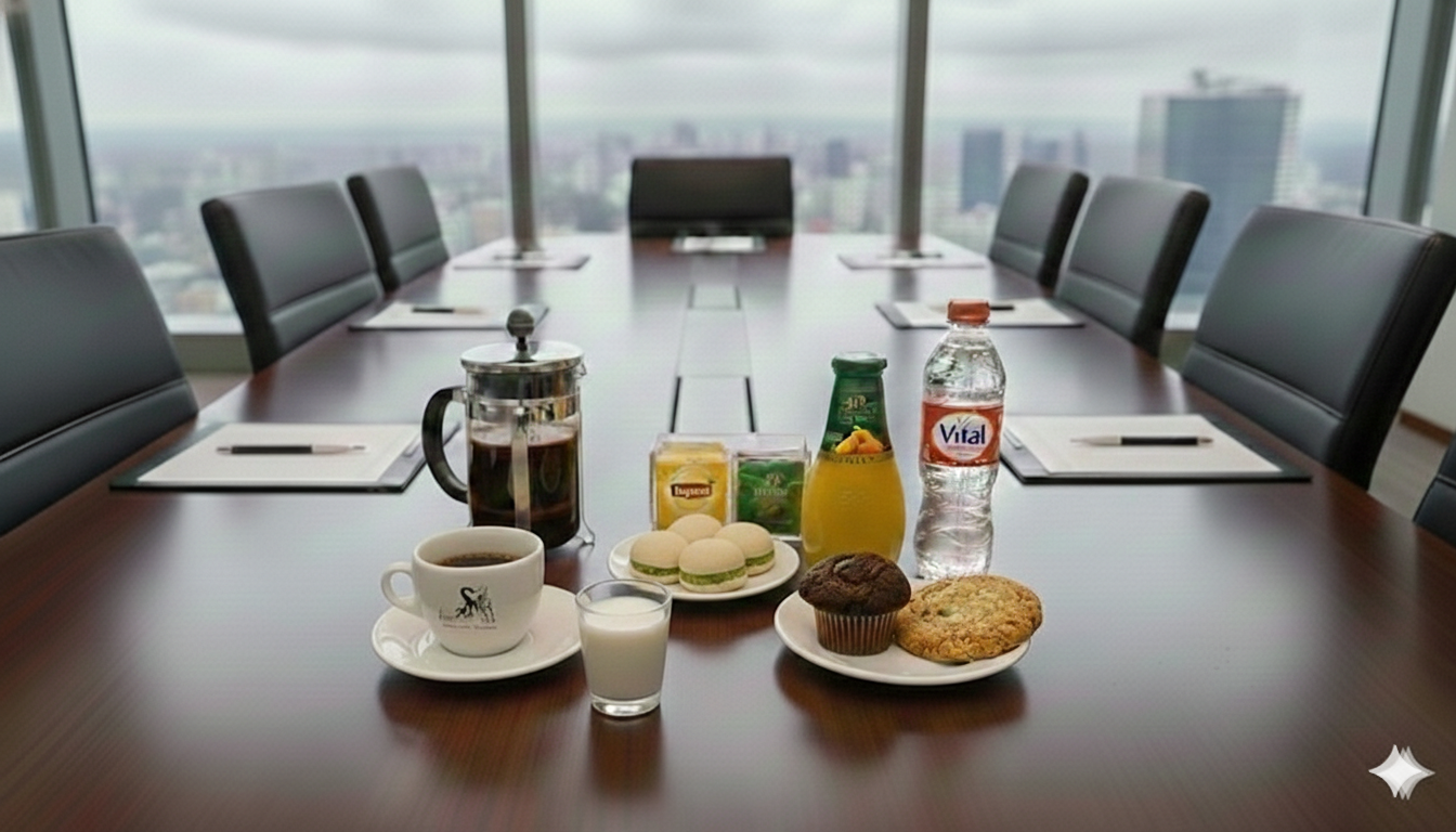 Incluye Servicio de asistencia en Líquidos para 10 personas, se compone de 1 Café de Grano o 1 Té De infusiones o Lipton, 1 Jugo Natural, 1 Agua Mineral, Leche descremada a gusto, 3 tapaditos con rellenos surtidos (como, Jamón Serrano, pimentón ciboulete, cherry, queso crema, entre otros), 1 Muffin, 1 Galletón de avena por cada unidad.